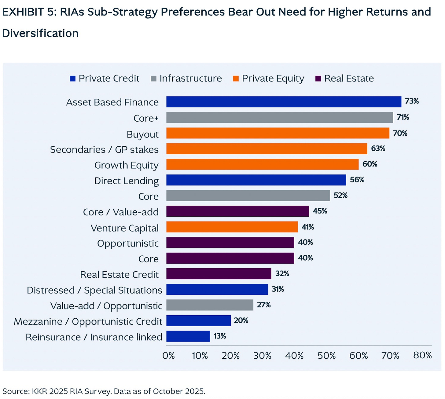 KKR’s recent RIA Survey finds that many advisors are choosing evergreens over traditional drawdown funds. Interval funds also rank high on the list of vehicle types that RIAs are using to implement private markets investments.