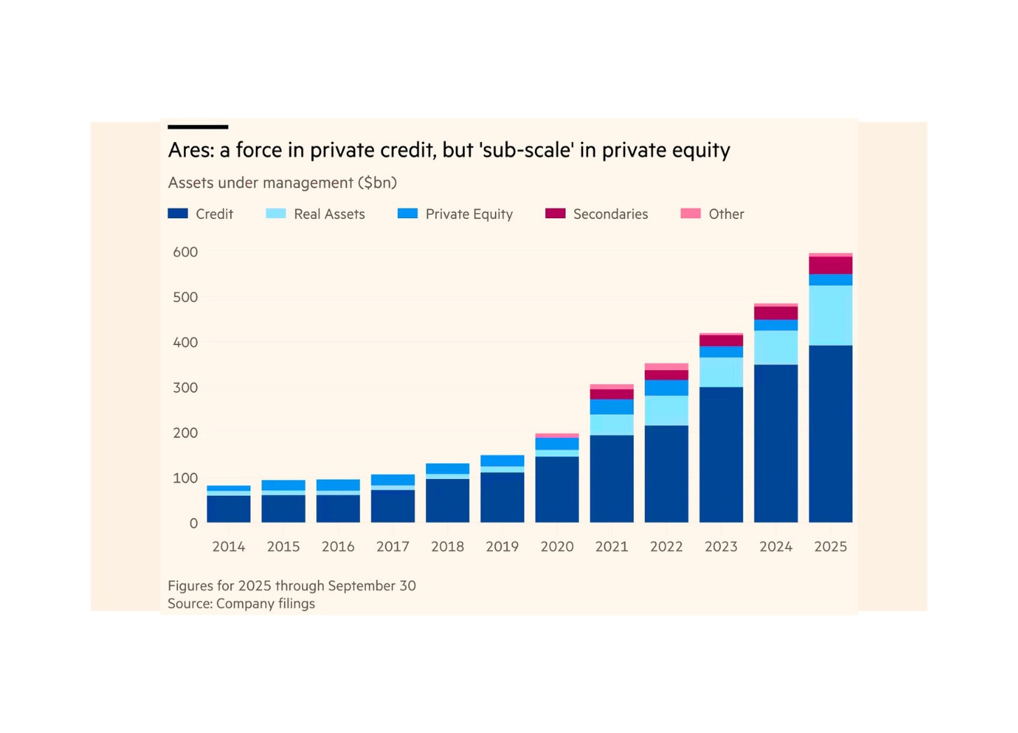 Ares’ private equity franchise sits at $25B today, not yet reaching the heights of the credit strategies, as the below chart from the FT illustrates.
