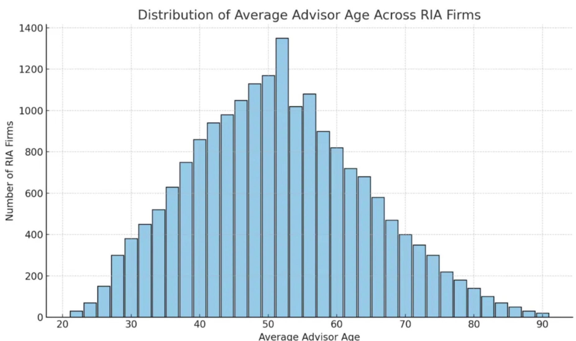 Data from a 2025 Advisor Demographics report from AdvizorPro finds that the average age of a US financial advisor is 46.7 years old, with a median age of 46.