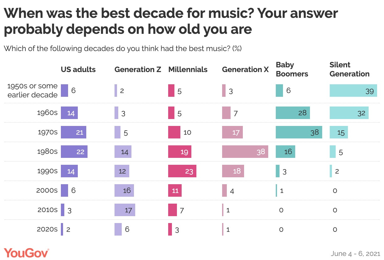 Well, what a coincidence. A 2021 YouGov survey finds that Gen X, Millennials, and Gen Z all have the 80s music in their top three decades for the best music.