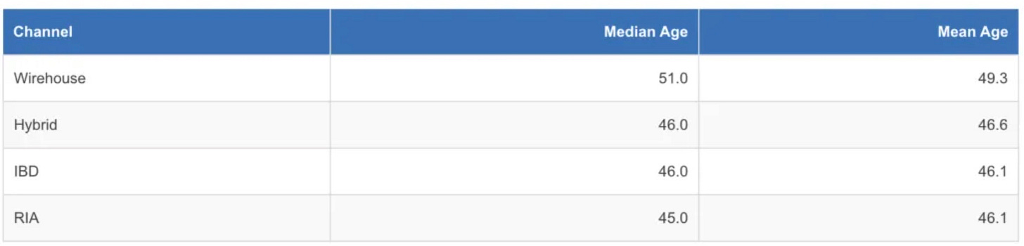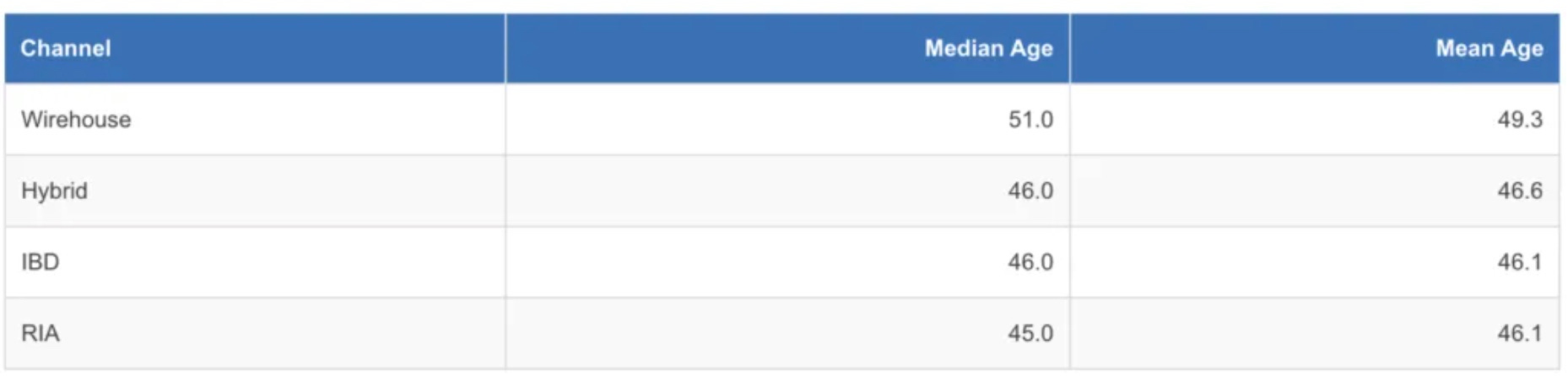 When age demographics of advisors are broken down by channel (i.e., wirehouse, IBD, RIA), the average age of advisors falls squarely within the Gen X cohort.