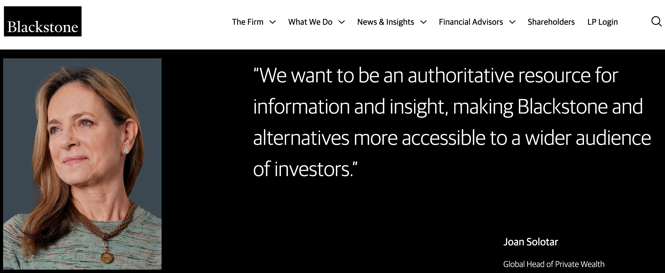 Blackstone’s integrated and nuanced marketing strategy enables the firm to reach the different demographics in the wealth channel (and institutional investors, too).
