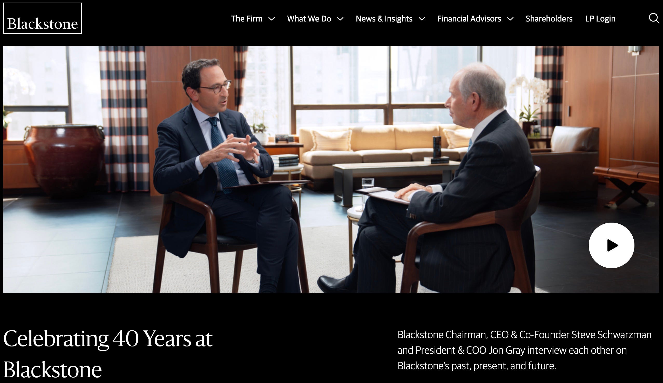 Part of Blackstone’s brilliance is the firm’s willingness to embrace the meme to meet certain cohorts of current and future customers where they are. They are able to embrace irreverence while never forgetting the true institutional nature of what they do as investors and stewards of $1.2T in individual and institutional capital, as exhibited by the 36 minute video featured on the front page of their website which dives into the history of the 40 years of Blackstone.