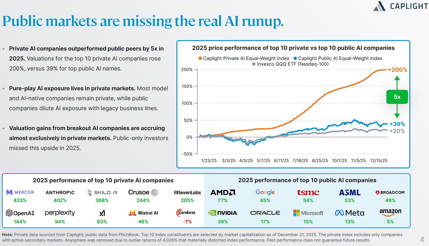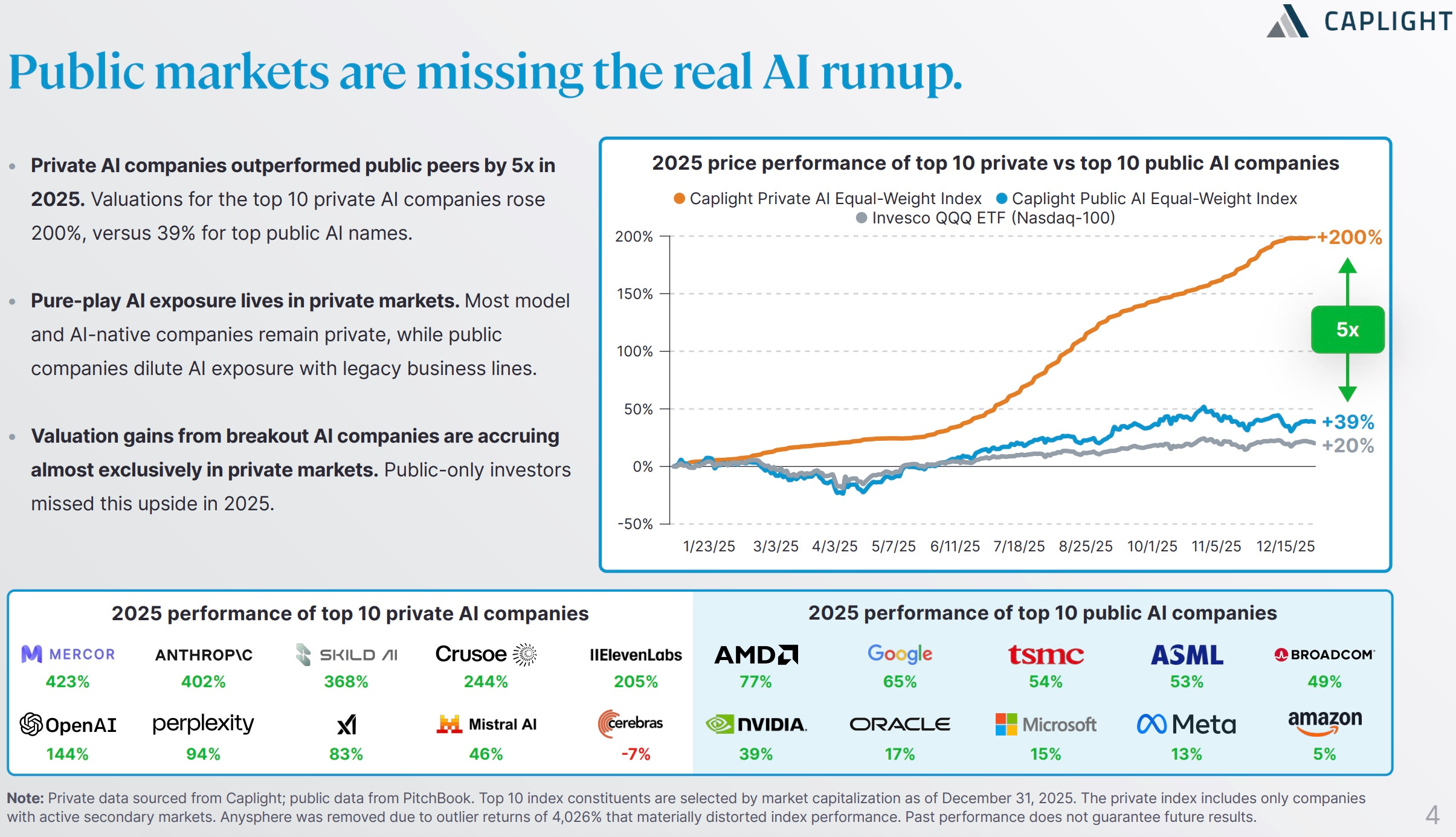 Private companies, particularly the top 10 private AI companies, saw meaningful valuation increases in 2025. Performance in private markets far outstripped public AI counterparts, as the below chart from Caplight shows.