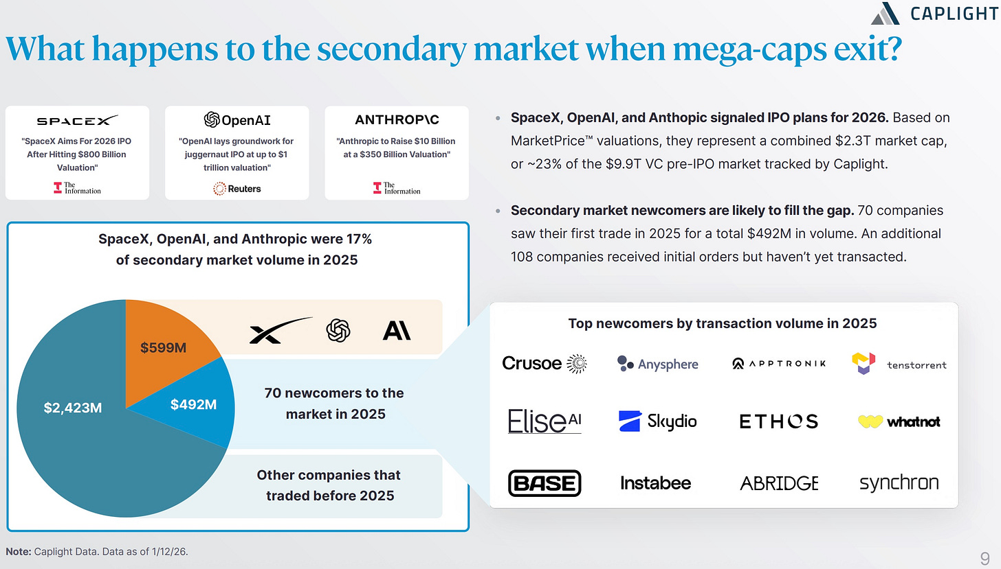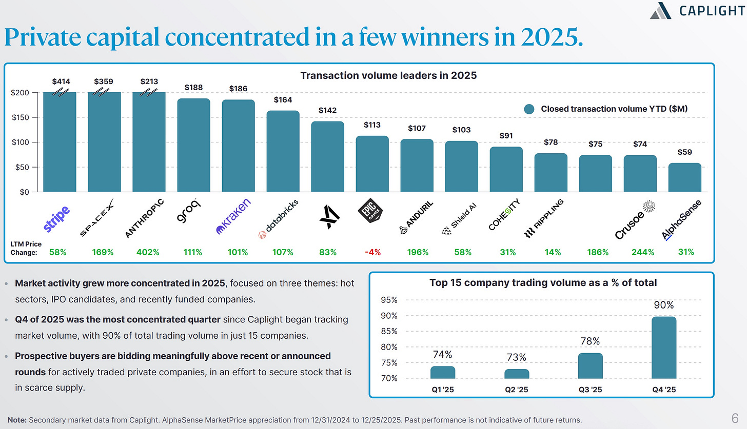 Data from Caplight’s 2025 Secondary Market Update highlights that the secondary market for late-stage private companies was concentrated in a few key names — Stripe, SpaceX, Anthropic, Groq, Kraken, and Databricks, amongst a few others.