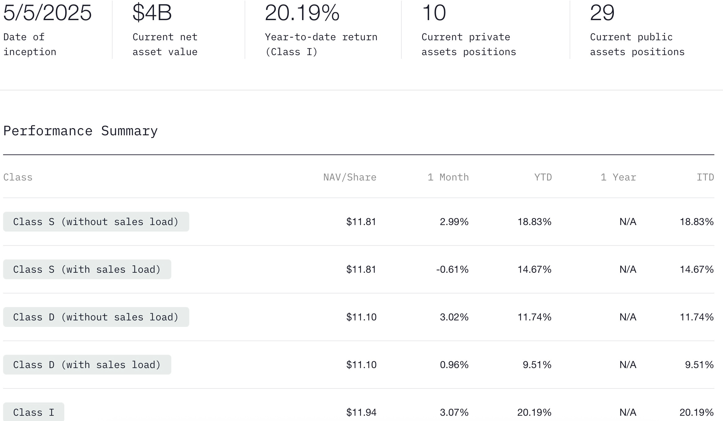 CTEK, which was seeded by Jeff Bezos and Michael Dell’s family offices, respectively, has grown to $4B of NAV across 10 private assets positions and 29 public assets positions since 5/5/2025, with the fund’s 20.19% inception-to-date return (Class I) largely driven by the fund’s private assets position.