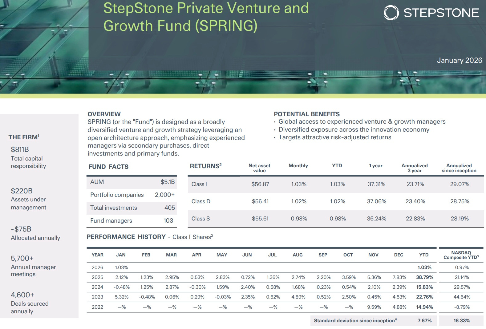 StepStone’s SPRING fund, a broadly diversified venture and growth strategy that invests across funds, co-investments, and secondaries, also has meaningful exposure to some of private markets’ largest companies.