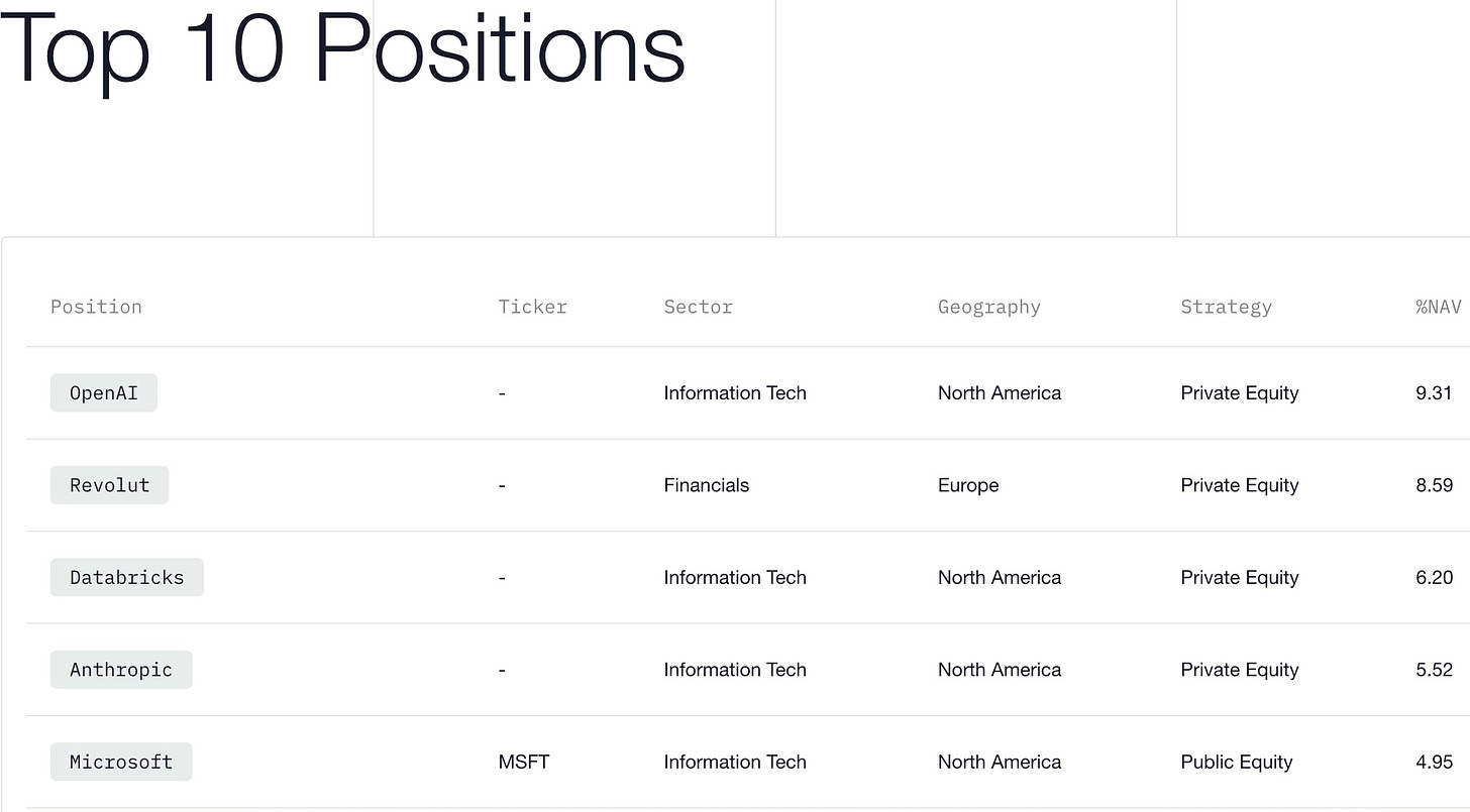 Private markets behemoths OpenAI, Revolut, Databricks, and Anthropic have comprised 29.62% of the fund. The largest public position? Microsoft.