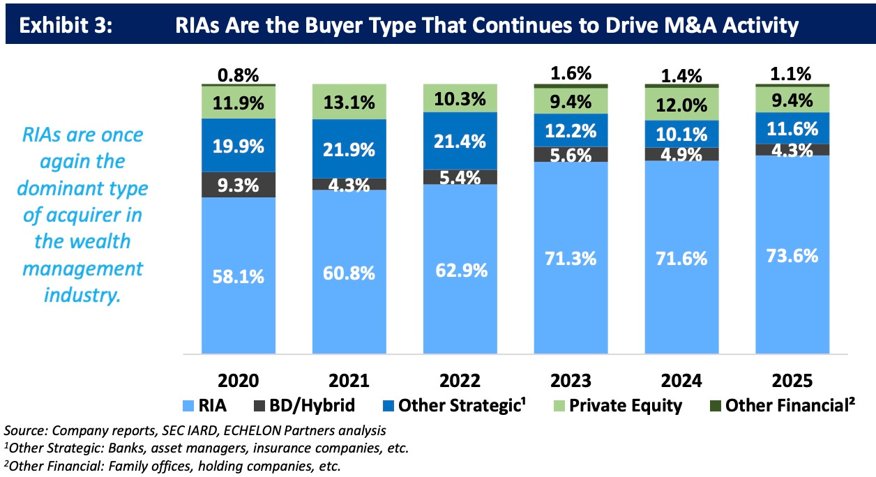 Consolidation, however, is driven mainly by RIAs, rather than private equity, BD/hybrid firms, or other strategic investors. Over 73% of 2025 acquisitions were completed by RIAs, with private equity representing only 9.4% of deal volume.
