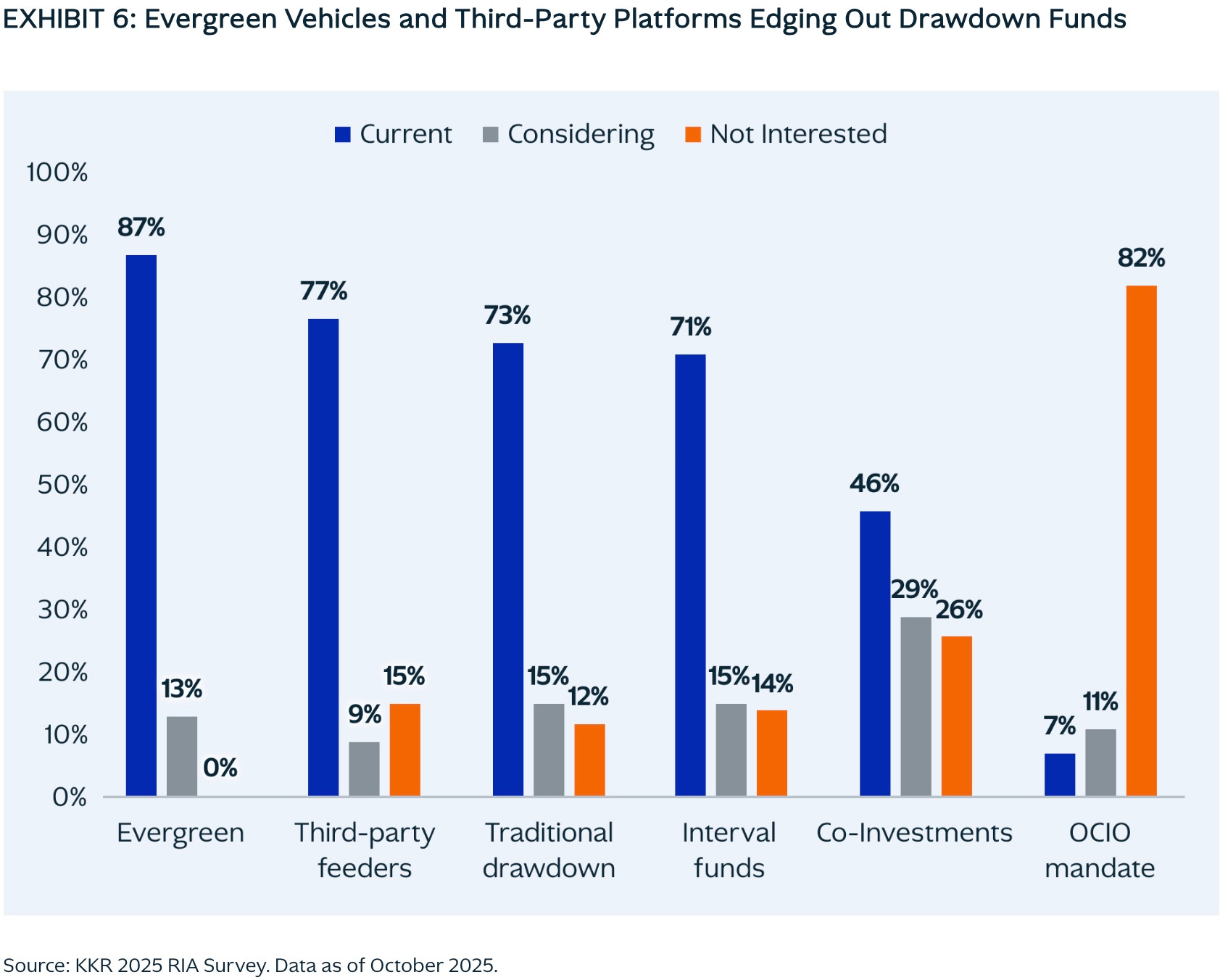 Many of the RIAs surveyed by KKR noted that they currently employ evergreen funds, “edging out drawdown funds.”