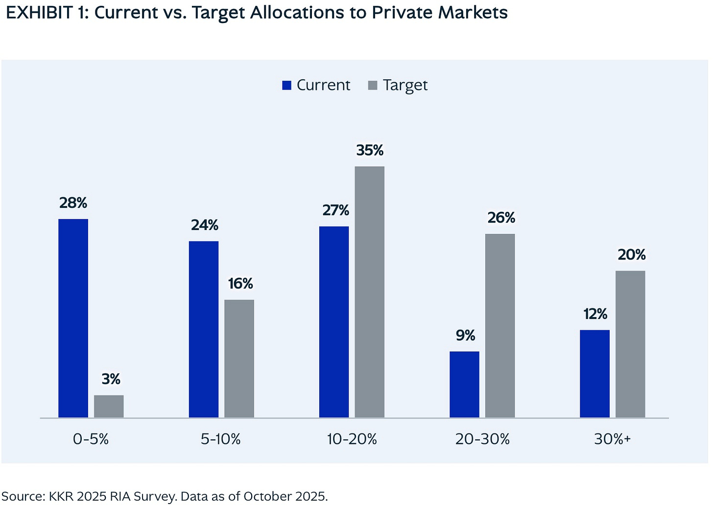 It does appear, however, that many advisors and wealth clients are looking to increase their exposure to private markets, as the below chart from the KKR 2025 RIA Survey illustrates.