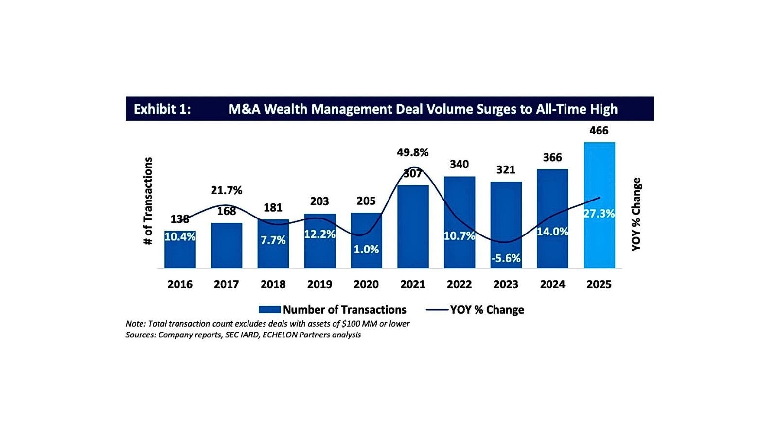 A recent report from Echelon Partners highlights the state of the industry. M&A wealth management deal volume reached an all-time high in 2025. The industry’s 466 M&A deals in 2025 represented a 27.3% YoY increase from 2024, which was the industry’s previous record year in M&A deal volume.