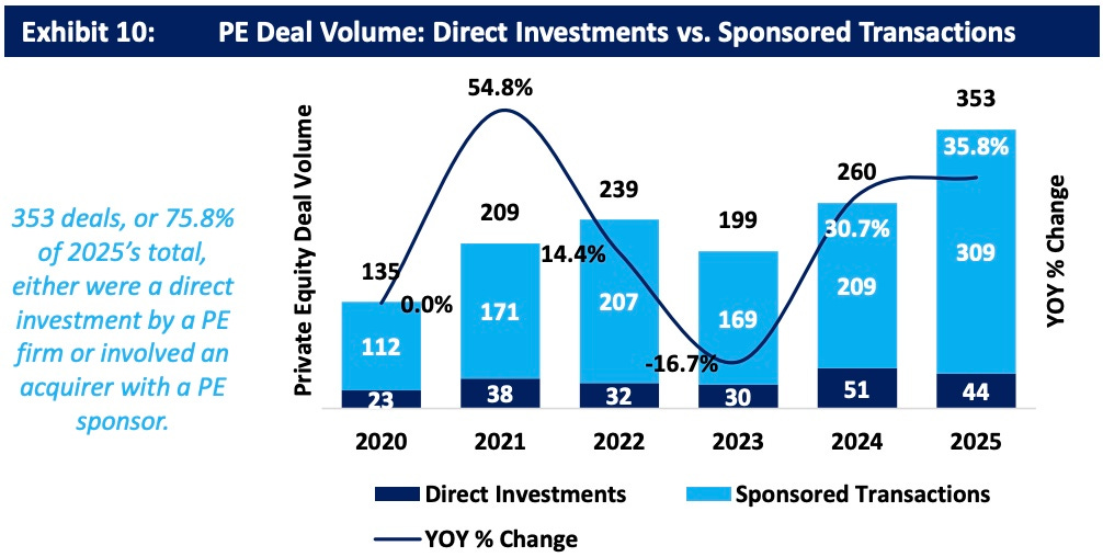 Almost 76% of 2025’s deals involved a private equity sponsor, either via a direct investment by a PE firm or a PE-backed RIA platform that consolidated with another wealth management firm.