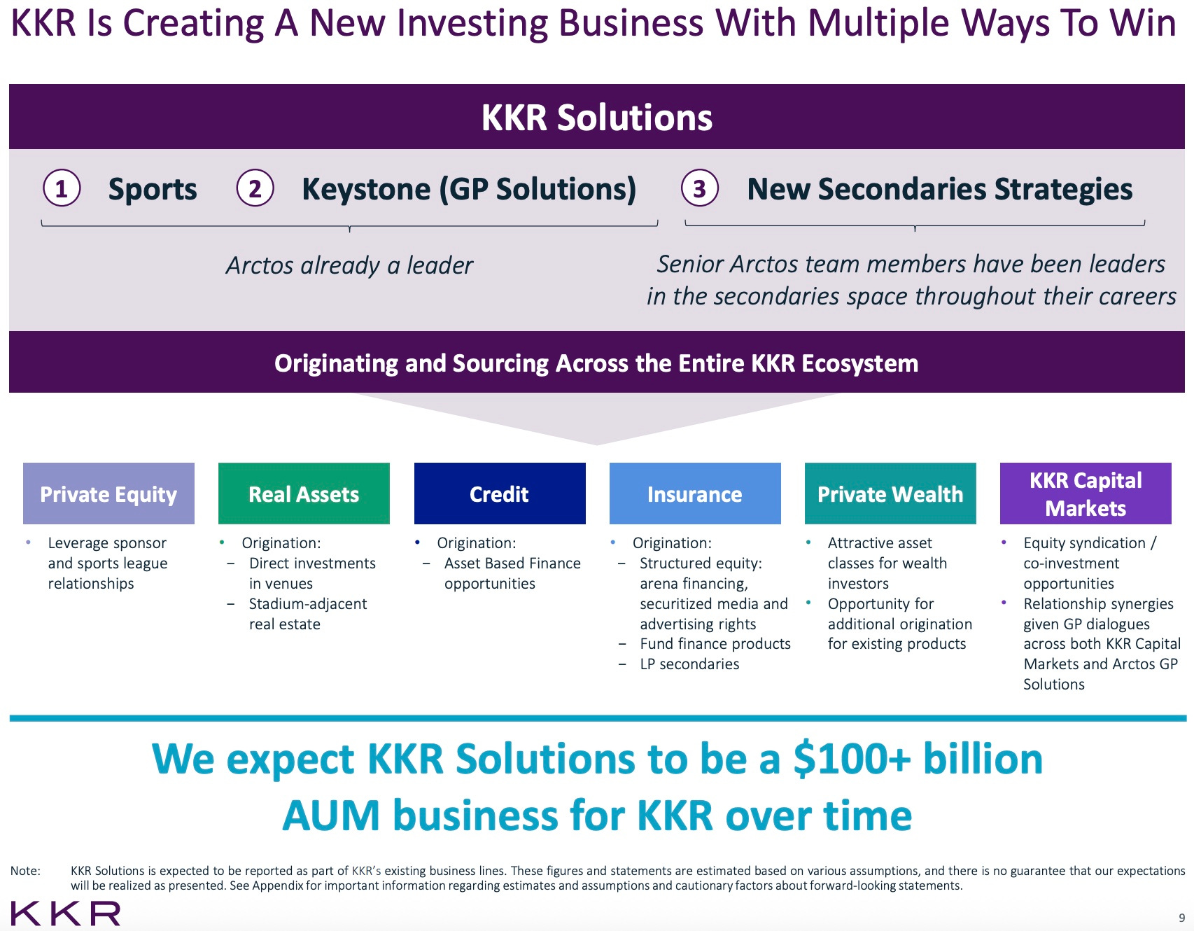 Not only will Arctos continue to execute on its Sports and GP Solutions strategies, but it appears that the expectation is that KKR will also add other secondaries strategies to the KKR Solutions platform, as the chart below highlights.