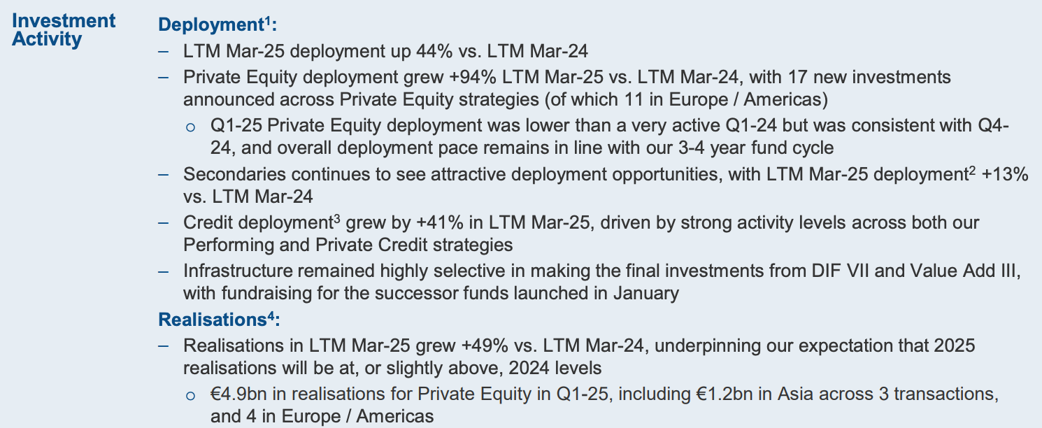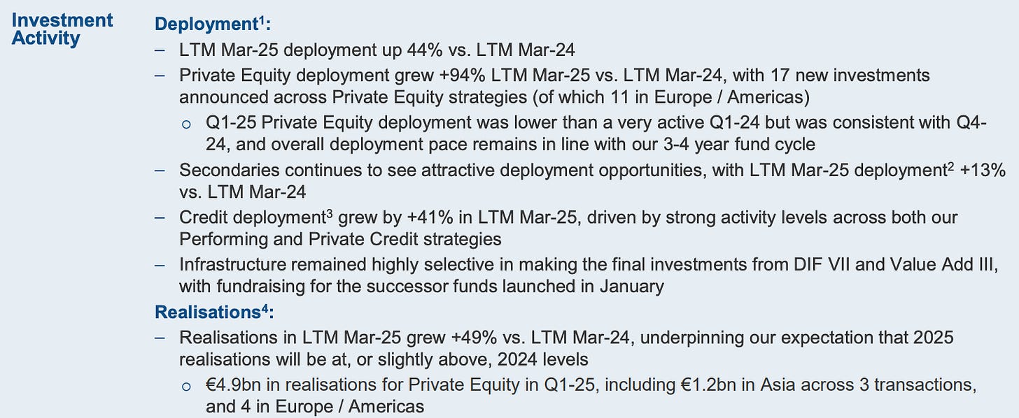 The takeaway: Private equity deployment was +94% YoY, highlighting the opportunity to invest in a market that has been impacted by volatility and changes in the valuation environment. CVC saw an increase in realizations, highlighting the firm’s focus on DPI.