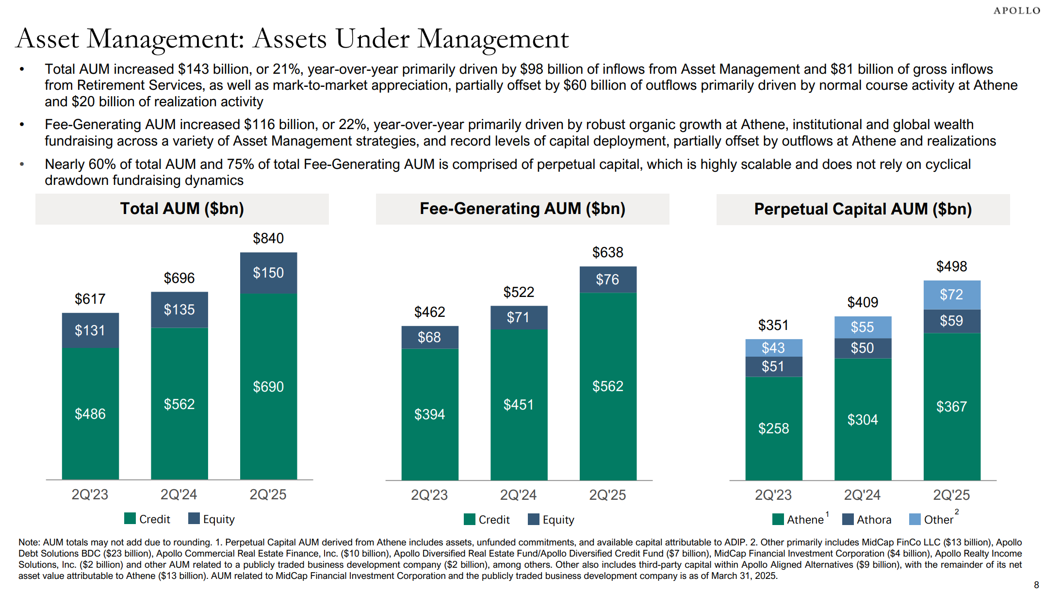 The chart: Apollo’s total AUM increased 21% YoY to a record $840B, driven by both Asset Management ($98B) and Retirement Services ($81B).
