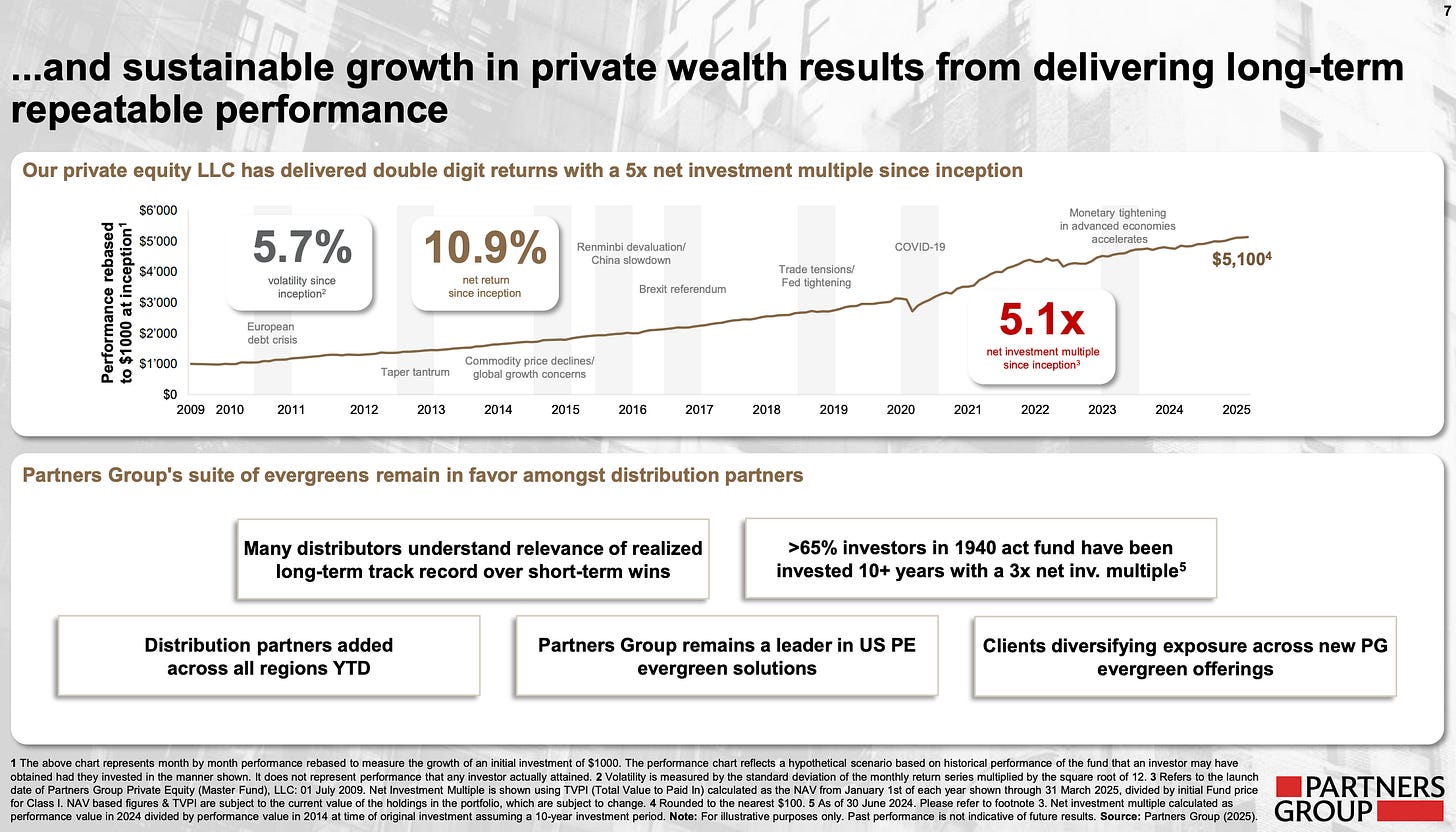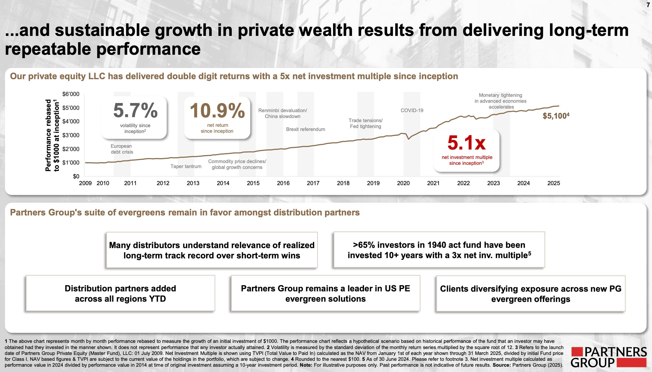 The takeaway: Patience is critical in investing. Investors that have let their capital compound in the Partners Group evergreen private equity LLC since 2009 would have enjoyed a 5.1x net multiple since inception.