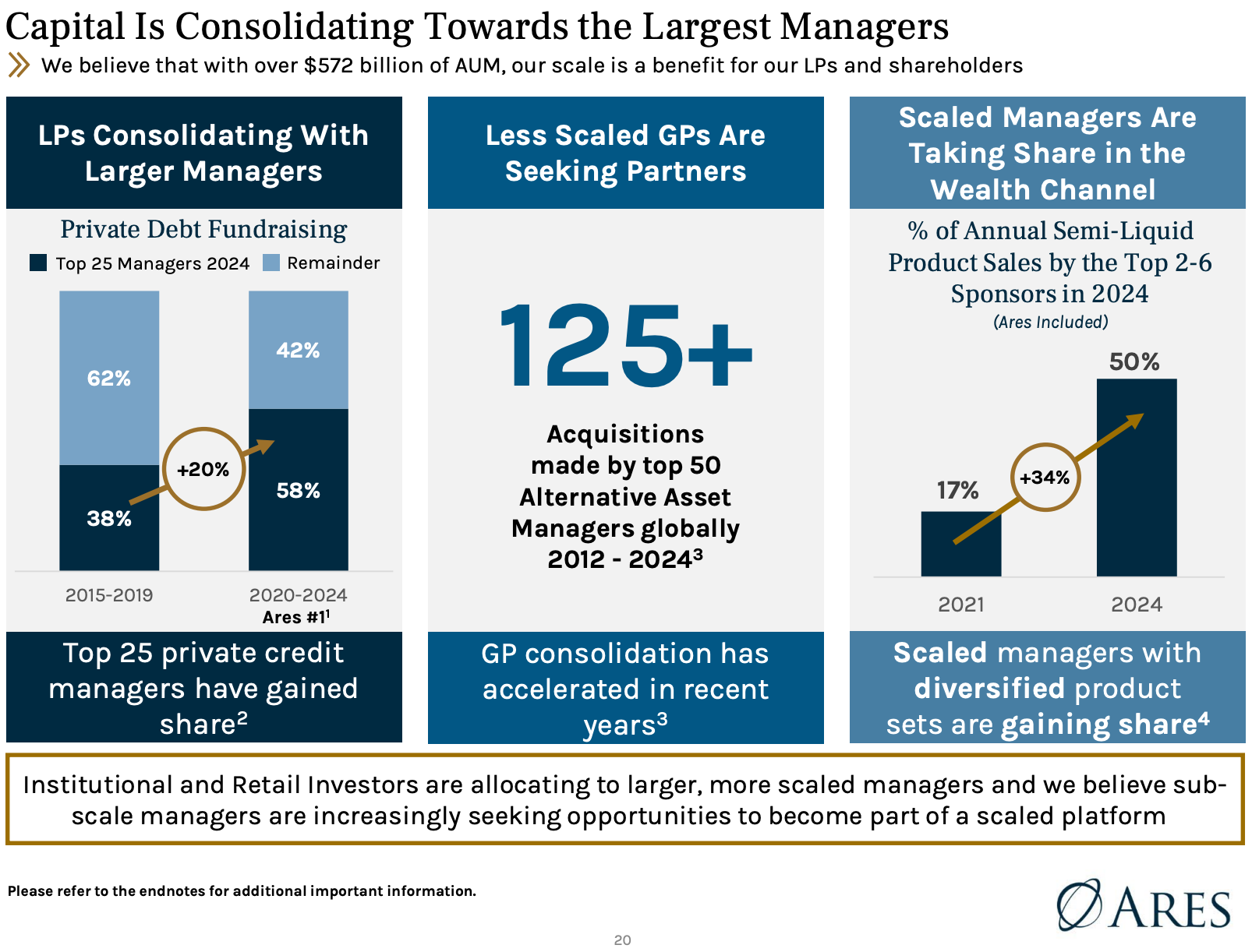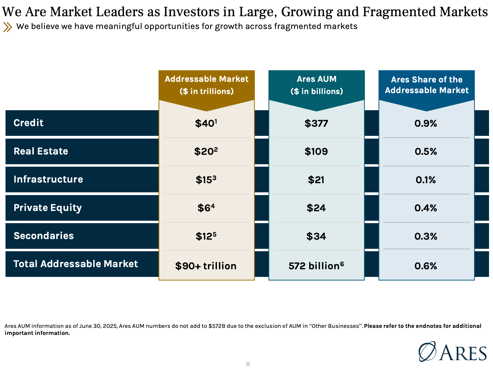 The takeaway: Each category of private markets is large, growing, and fragmented. Ares’ share of each respective market highlights that (1) Ares can continue to grow as a market leader and (2) there can be a number of relative and absolute winners in private markets due to the sheer size of these markets.