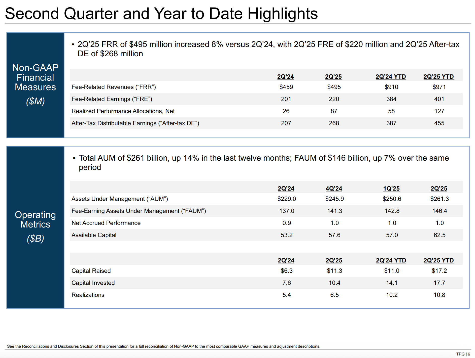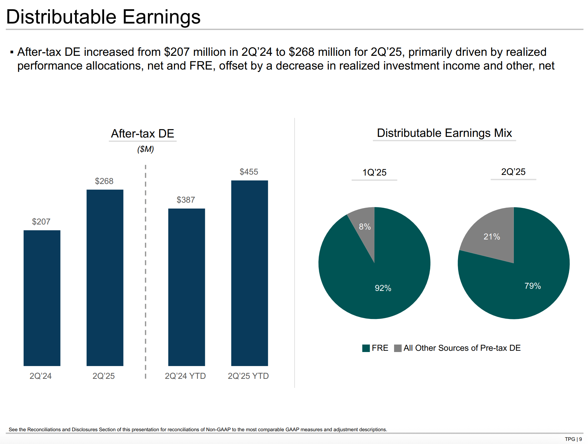 The chart: TPG’s after-tax distributable earnings (“DE”) increased from 2Q24 to 2Q25.