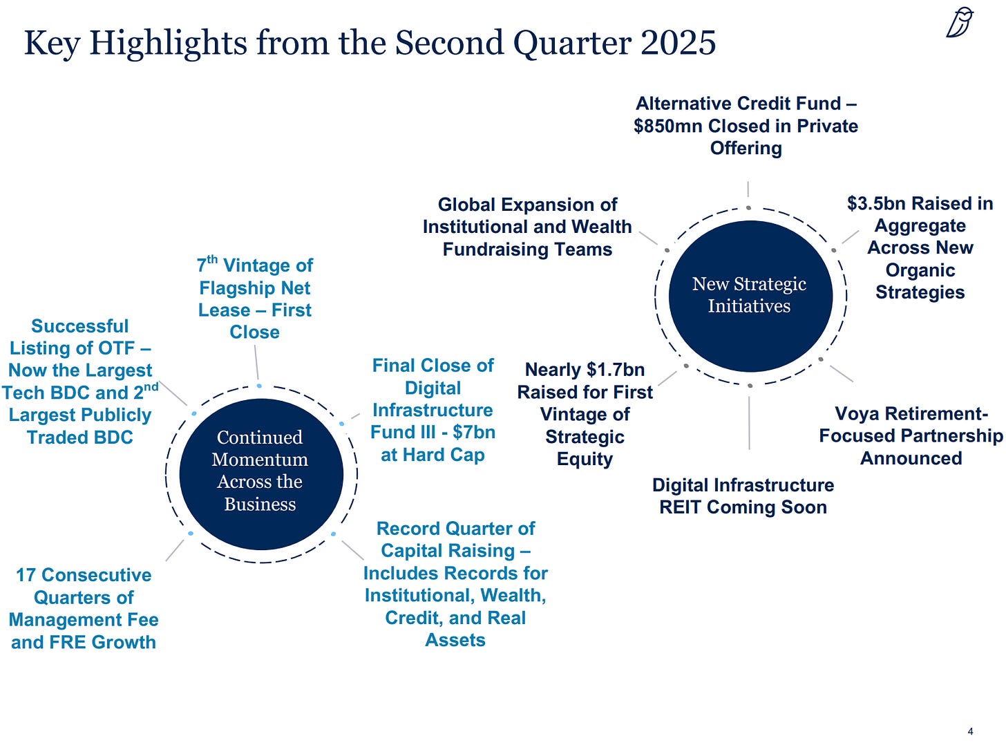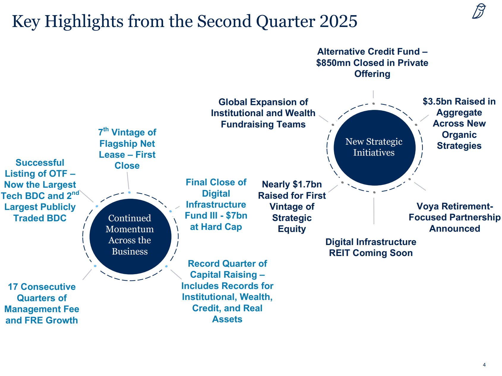 The chart: Blue Owl saw continued momentum across the business, achieving its 17th consecutive quarter of management fee and FRE growth. New strategic initiatives included a retirement-focused partnership with Voya and the $850M raise of its Alternative Credit Fund.