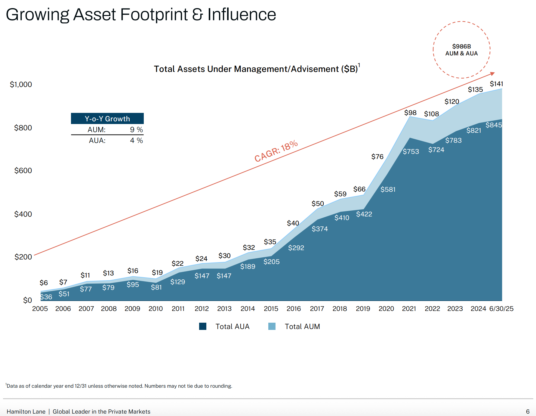 The chart: Hamilton Lane’s AUM / AUA has grown at 18% CAGR since 2005.