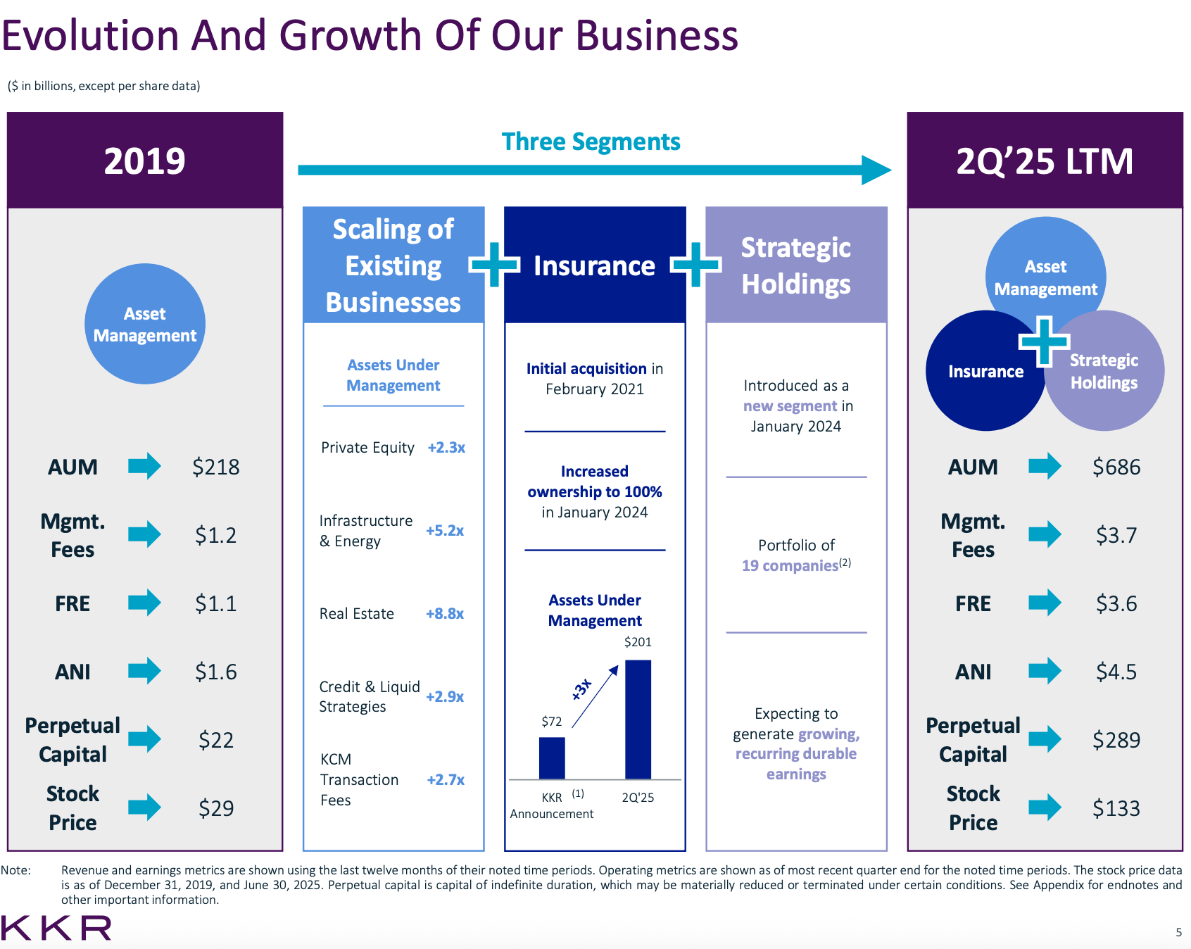 The chart: KKR has experienced meaningful growth as its business has evolved to add insurance from its acquisition of Global Atlantic in 2021 and build out its Strategic Holdings segment in 2024.