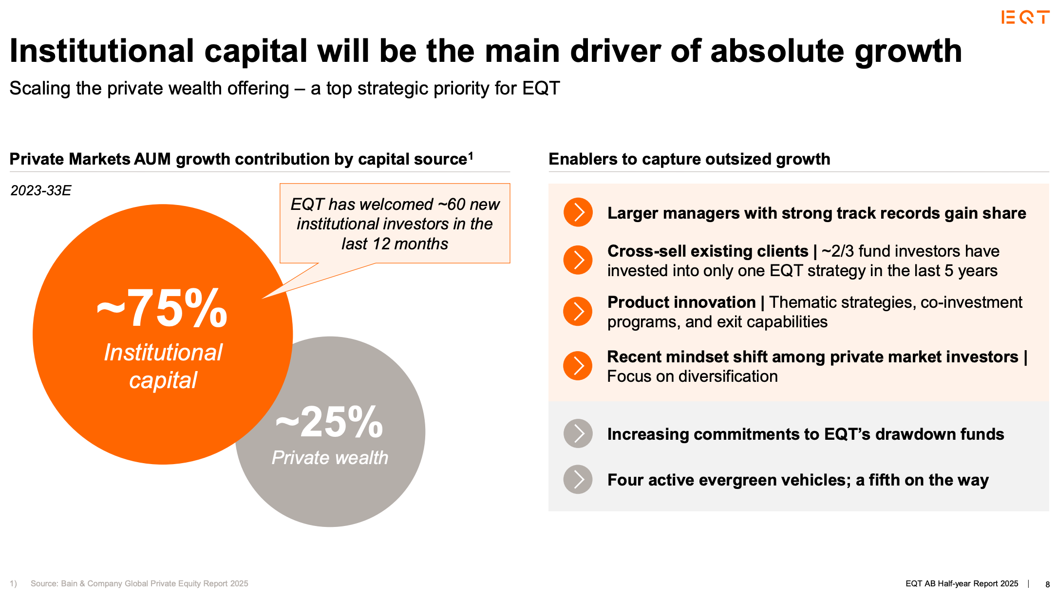The chart: Institutional capital represents ~75% of EQT’s AUM, with the firm welcoming 60 new institutional investors over the last 12 months.