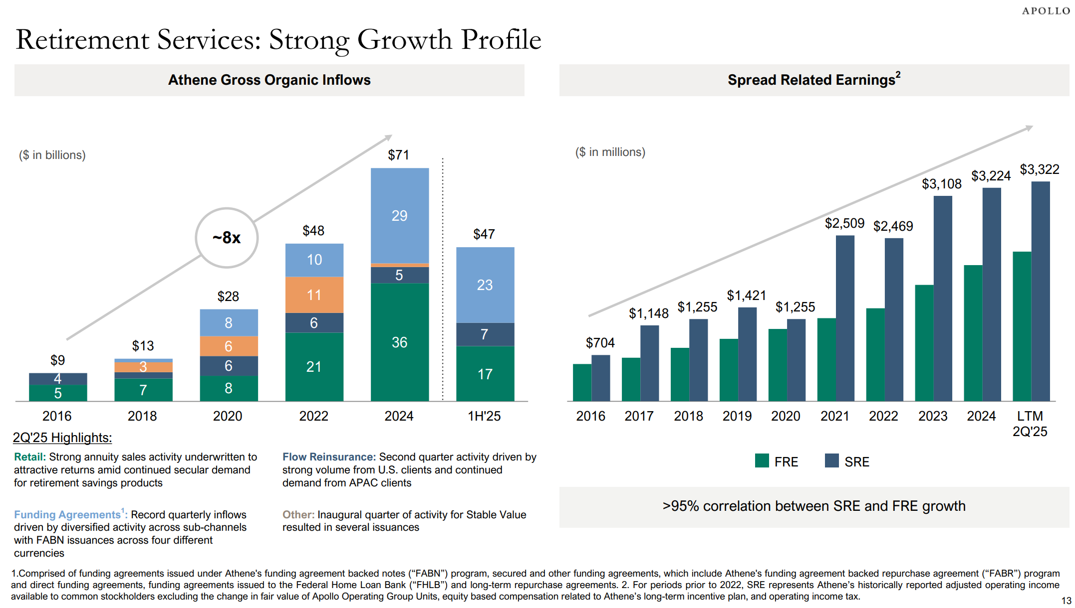 The takeaway: Athene has been a major driver of growth for the firm, leading to $3.3B in SRE. Apollo also notes a >95% correlation between SRE and FRE growth.