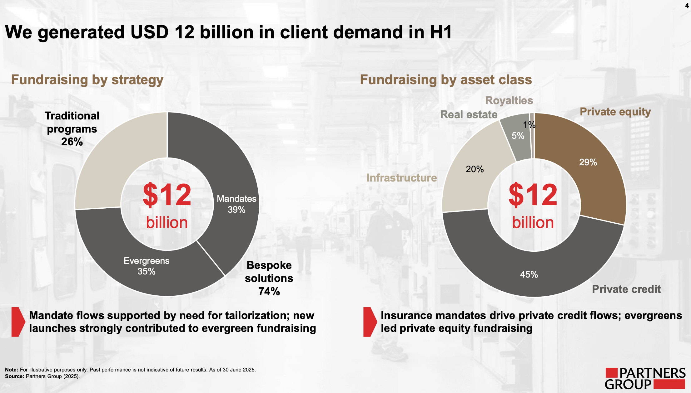 The takeaway: Much of Partners Group’s inflows were driven by bespoke solutions (74%), with mandates and evergreens comprising the majority of the $12B in flows in H1.