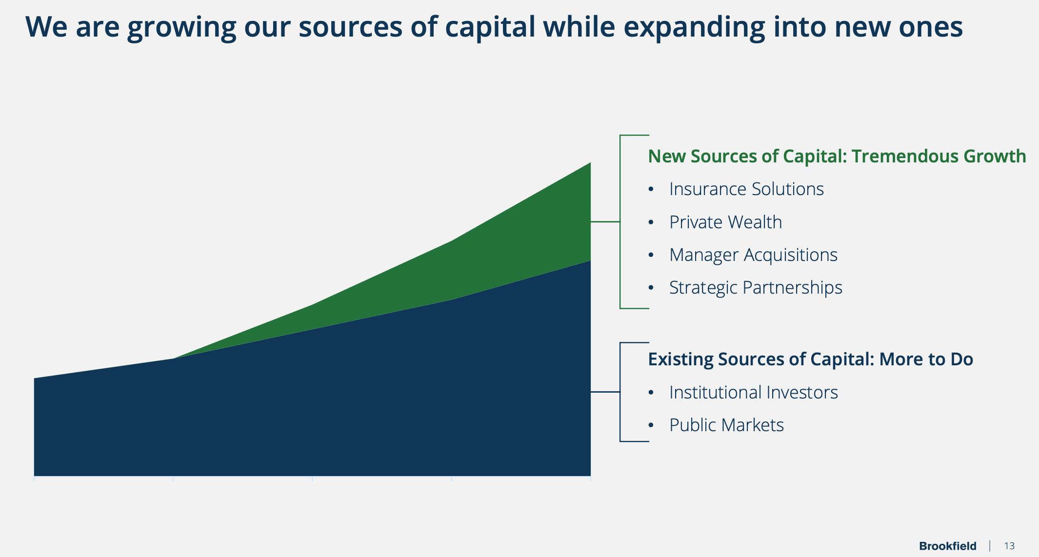 The chart: Brookfield is growing via the channels that are unlocking growth for alternative asset managers, with insurance, private wealth, acquisitions, and strategic partnerships.