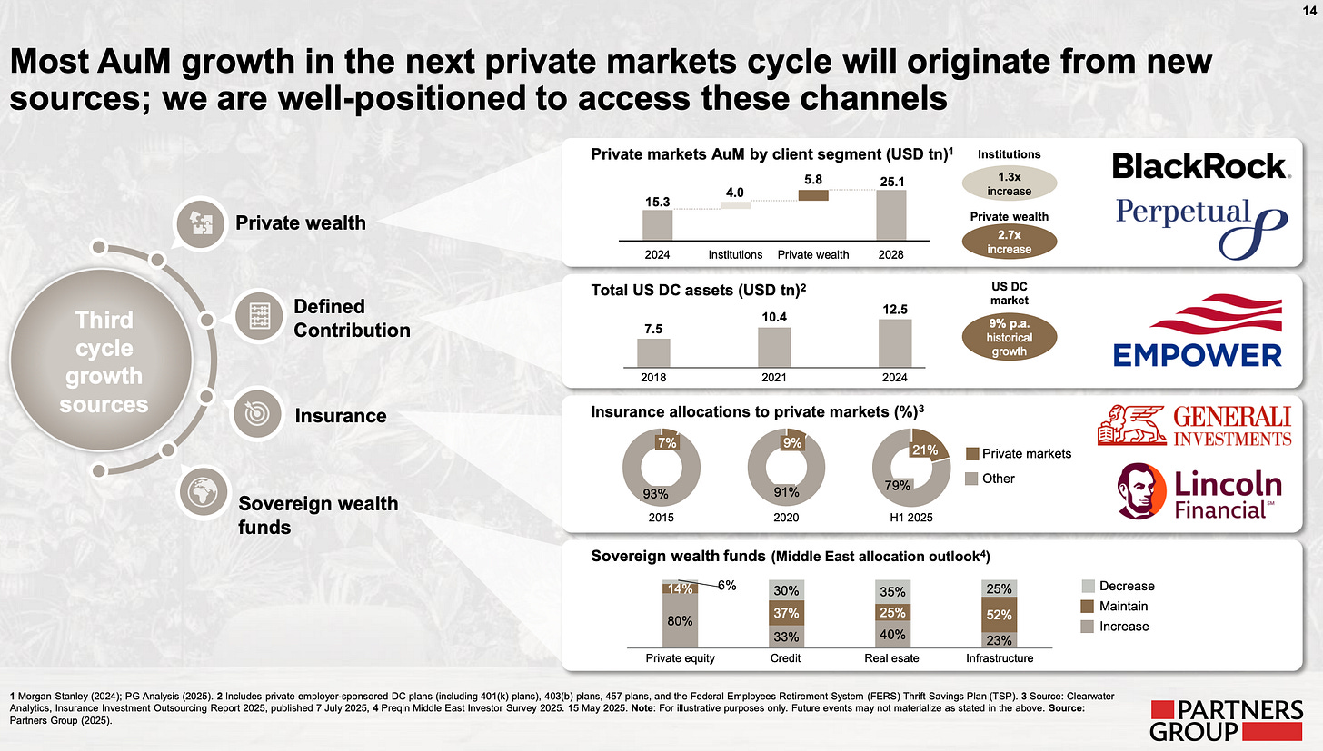 The chart: Partners Group highlights four investor channels that will drive growth in AUM for private markets: private wealth, defined contribution (401(k) plans), insurance, and sovereign wealth funds.