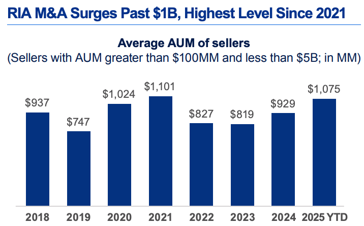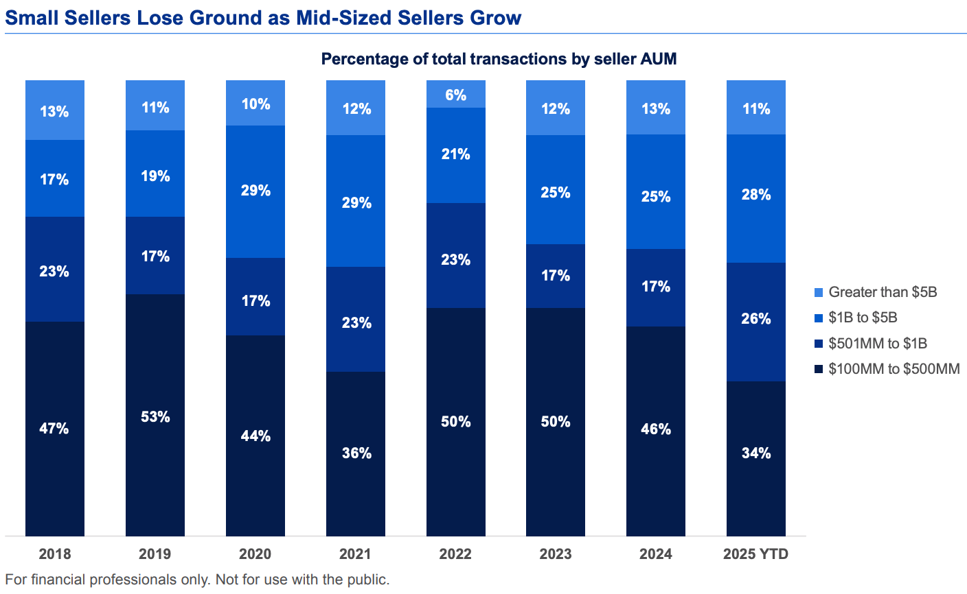 Three charts from DeVoe & Company’s Q2 2025 RIA Dealbook highlight the trend of larger RIAs becoming an increasingly larger part of the M&A transaction activity.