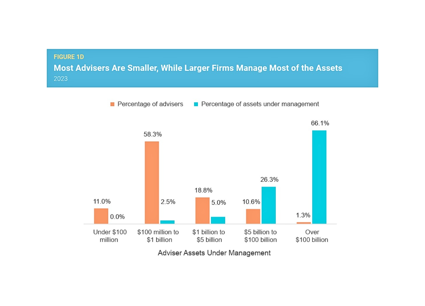 A chart from the Investment Adviser Association highlights that to the scaled players go the spoils. This trend was particularly acute in 2023, when firms over $100B in AUM saw the biggest increase in AUM relative to firms of smaller sizes.