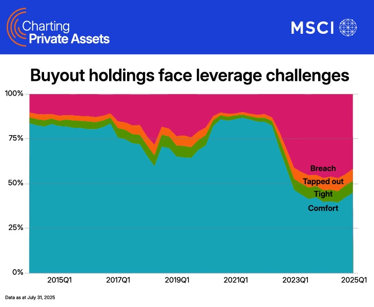 By Q1 2025, roughly 55% of buyout holdings sat in the tight, tapped-out or breach zones of their leverage cap, a limit to manage borrowers’ risk. The squeezed leverage could hamper the growth options for portfolio companies — and their private-equity owners.